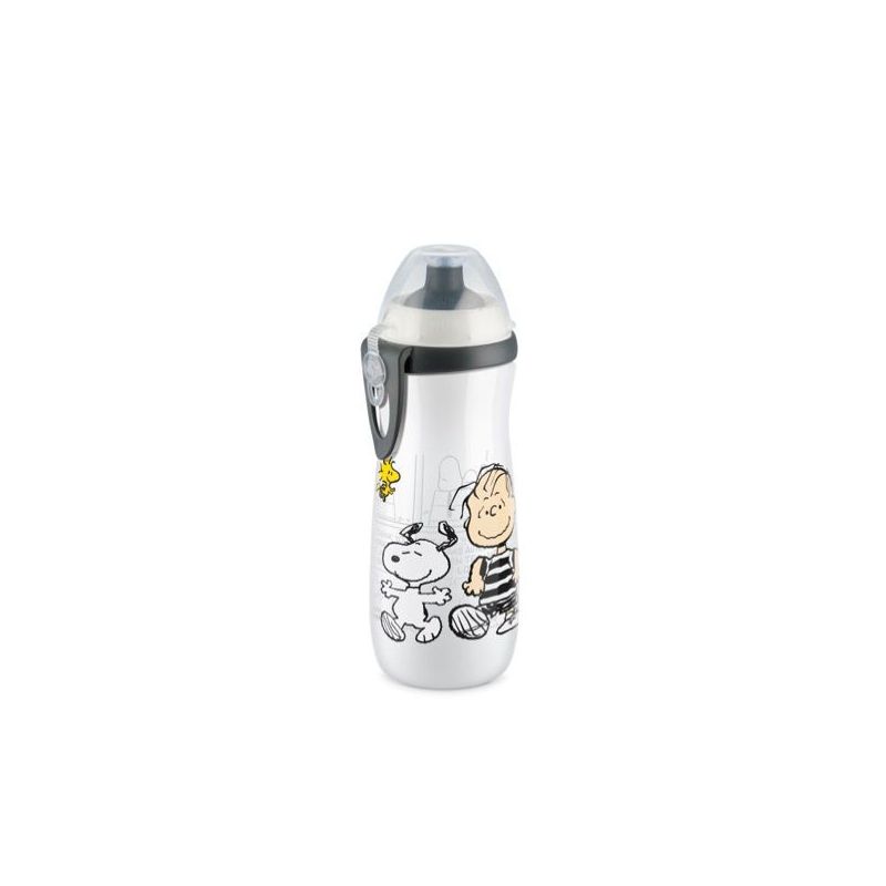 La nueva Nuk Sport Cup para niños a partir de 36 meses, aparecen Linus y Snoopy que estan calentando antes del proximo partido de beisbol. Facil de abrir y cerrar , su practica boquilla push-pull de silicona transparente es a prueba de goteo. Tambien es especialmente duradera e higienica. El vaso esta fabricado de polipropileno resistente, extra ligero y su forma redondeada asegura que, incluso las manos de los niños, puedan agarrarla bien. Sus colores le dan un aspeto muy moderno.