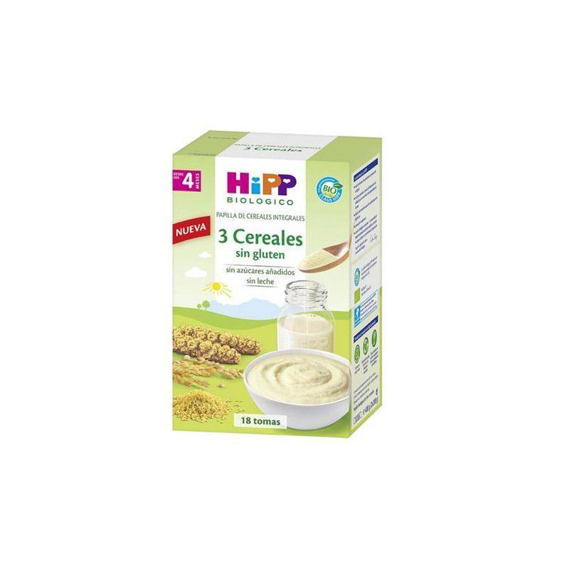 Papilla ecológica mijo, arroz y maíz. La Papilla 3 Cereales sin Gluten BIO de HIPP es una fórmula de fácil digestión, sin azúcares añadidos y sin leche, producida con cereales sin gluten (mijo, arroz y maíz) BIO cuidadosamente seleccionados. Está indicada a partir de los 4 meses junto con la leche materna o la leche que tome el bebé habitualmente. Además, la Papilla 3 Cereales sin Gluten BIO de HIPP está enriquecida con Tiamina (Vitamina B1).