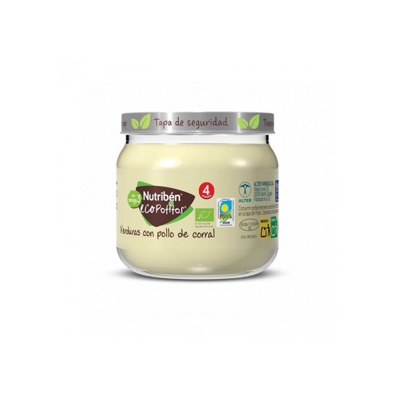 Nutribén® EcoPotitos® Verduras con pollo de corral es un alimento infantil destinado a niños a partir del 6º mes de edad. Fabricado por Alter Farmacia S. A., Mateo Inurria, 30, 28036 Madrid (España). Nutribén® EcoPotitos® Verduras con pollo de corral está elaborado a partir de ingredientes procedentes de agricultura ecológica cumpliendo el Reglamento (UE) 2018/848 sobre producción ecológica y etiquetado de los productos ecológicos y por el que se deroga el Reglamento (CE) nº 834/2007 del Consejo. Nutribén® EcoPotitos® Verduras con pollo de corral cumple con los estándares de composición establecidos por la FAO (ONU) en el Codex Alimentarius para preparados alimenticios complementarios para lactantes de más edad y niños pequeños, y es producido con los ingredientes y nutrientes abajo indicados. El producto sigue las recomendaciones de la ESPGHAN (Sociedad Europea de Gastroenterología Hepatología y Nutrición Pediátrica) y cumple con el Reglamento 609/2013 relativo a los alimentos destinados a lactantes y niños de corta edad, los alimentos para usos médicos especiales y los sustitutivos de la dieta completa para el control de peso. Nutribén® EcoPotitos® Verduras con pollo de corral cumple toda la legislación europea relativa a pesticidas, residuos, sustancias tóxicas y perjudiciales. Listado de ingredientes en orden decreciente Agua de cocción Pollo* 15% Zanahorias* 10% Arroz* 6% Guisantes* 3,7% Almidón de maíz Aceite de lino* 0,7% Aceite de oliva virgen extra* 0,4% Cebolla* Zumo de limón* * de agricultura ecológica. Puede contener trazas de apio.