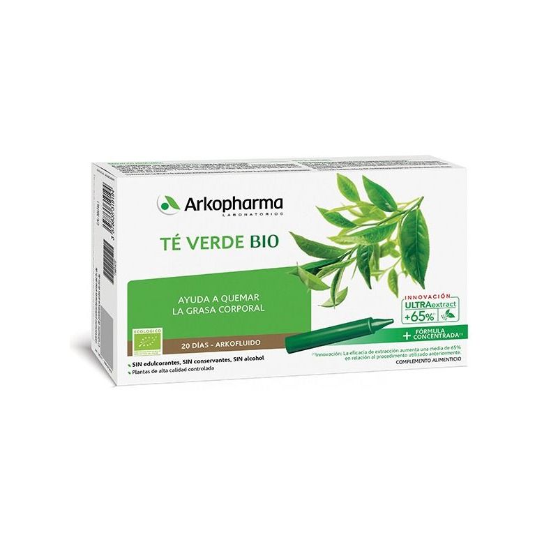 Arkofluido Té Verde BIO 20 Ampollas es un complemento alimenticio formulado a base de extracto acuoso de Té Verde. Su toma ayuda al metabolismo de los lípidos a la vez que reduce la acumulación de grasa corporal.