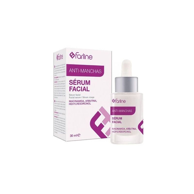 Farline Sérum Facial Antimanchas 30 ml es un tratamiento concentrado que ayuda a unificar el tono de la piel a la vez que estimula la renovación celular de la piel. Su efecto consigue atenuar las manchas y prevenir su aparición.