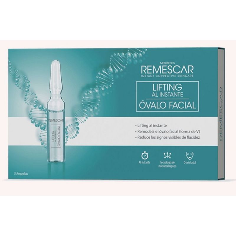 Remescar Lifting Óvalo Facial 5 Ampollas facial repara y regenera la piel y reduce los signos de flacidez de forma inmediata. El efecto lifting (en forma de V) devuelve un aspecto juvenil. Gracias a la tecnología avanzada que se ha utilizado, los ingredientes activos penetrarán en la piel hasta 10 000 veces más que otros productos tópicos.
