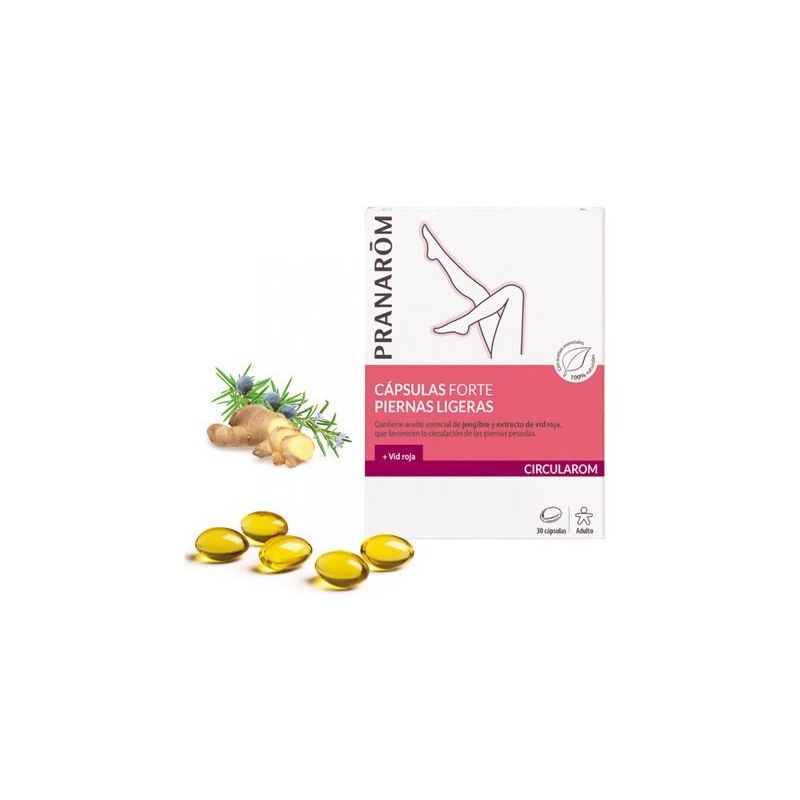 CIRCULAROM Cápsulas Forte Piernas ligeras ayuda a mantener una buena circulación sanguínea. Reduce la sensación de piernas hinchadas, pesadas y cansadas gracias a una sinergia de aceites esenciales que se potencia con un extracto de vid roja.
