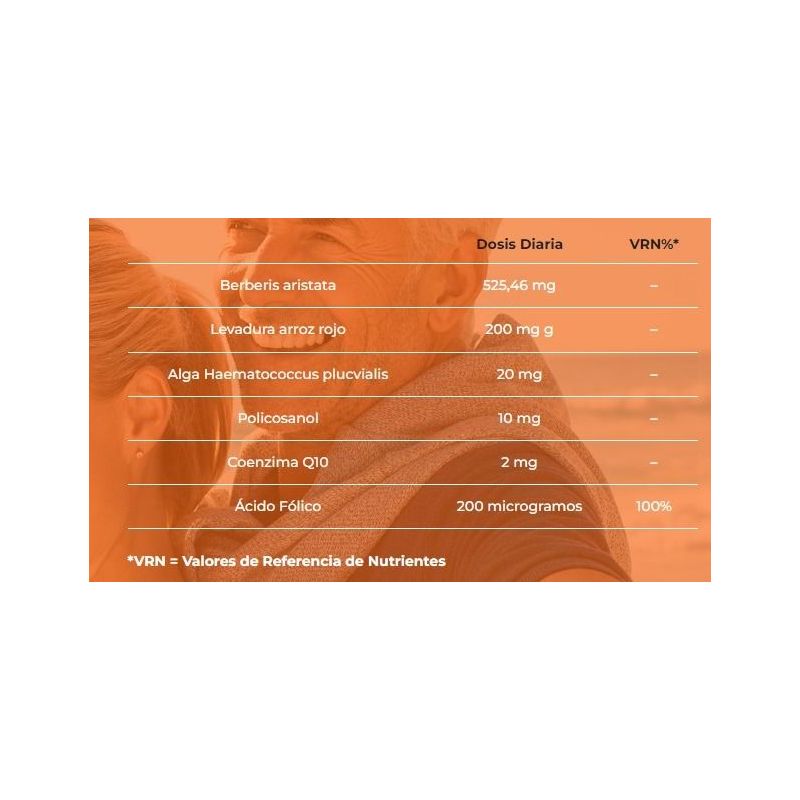 ÁCIDO FÓLICO (Vitamina B9): El ácido fólico es una vitamina hidrosoluble que tiene un papel importante en la regulación de la homocisteína. Un incremento en los niveles de homocisteína, consecuencia de una dieta inadecuada, podría facilitar el depósito y calcificación de lípidos en las arterias, que se volverían más rígidas. MABOlipid Plus aporta la cantidad diaria de ácido fólico recomendada. BERBERIS ARISTATA e. S: La Berberina es un alcaloide obtenido del extracto seco de la raíz Berberis aristata que favorece la regulación de los niveles sanguíneos de triglicéridos. POLICOSANOL: El Policosanol es una mezcla natural de alcoholes de cadena larga extraídos de plantas cerosas como la caña de azúcar (Saccharum officinarum). ARROZ ROJO: La levadura de arroz rojo se obtiene de la fermentación del arroz con una cepa denominada (Monascus purpureus). COENZIMA Q10: La Coenzima Q10 es un antioxidante presente de forma natural en nuestro organismo que ayuda a la protección contra el daño de los radicales libres, además de jugar un papel clave en la producción de energía celular. ASTAXANTINA: La Astaxantina es una sustancia carotenoide que procede del alga Haematococcus plucvialis y que podría tener asociada propiedades antioxidantes.