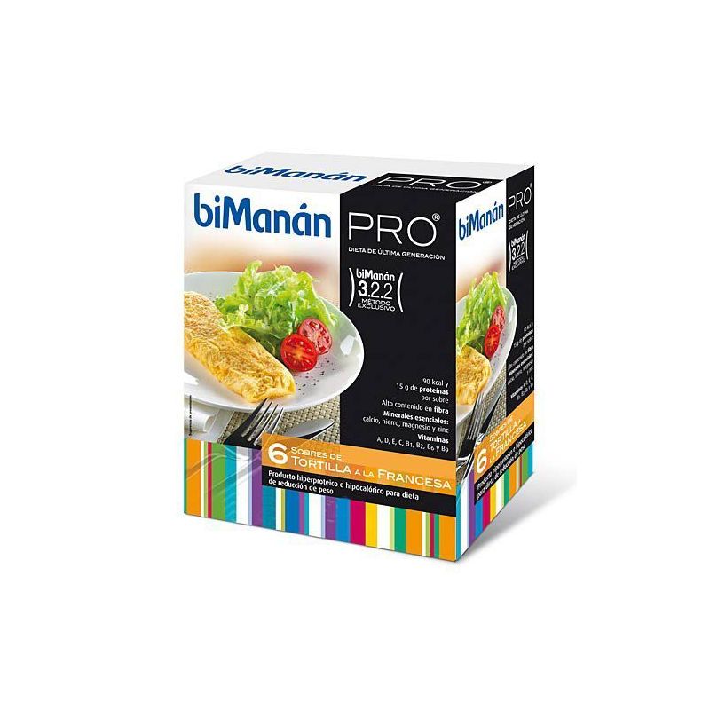 Bimanan Pro Tortilla sobre salado, es un alimento dietético hipocalórico e hiperproteico con un contenido reducido en hidratos de carbono y grasas. Rico en calcio, hierro, magnesio, zinc, cobre y vitaminas E, C, B1, B2, B3, B6, B9 y fibra. 107kcal por ración.
