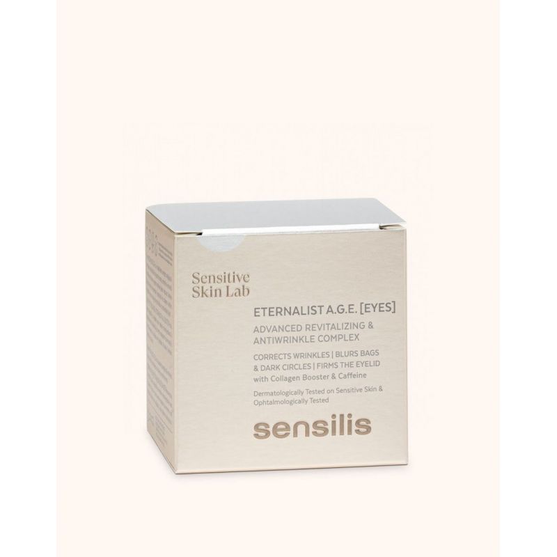 Crema reparadora para el contorno de los ojos con complejo revitalizante y antiarrugas avanzado que corrige arrugas, difumina bolsas y ojeras y reafirma el párpado caído. Incluye aplicador metálico Sensilis.