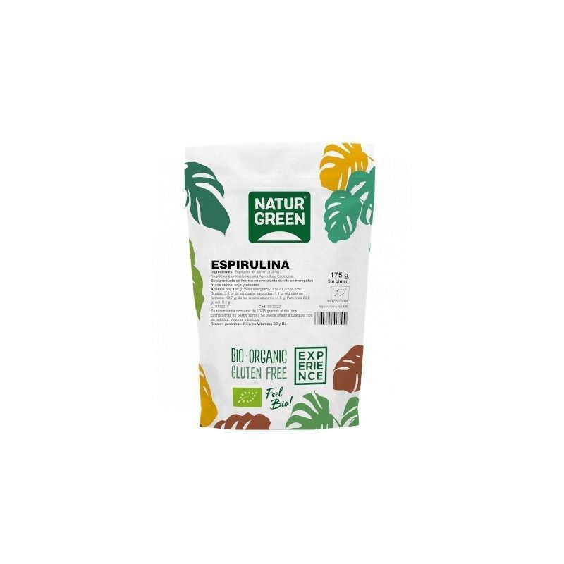 La espirulina Ecológica en polvo 175 g de NaturGreen es una alga unicelular con forma de espiral, de ahí su nombre. Es cultivada en agua dulce, deshidratada para conservar su poder nutricional y micro-pulverizada para una mayor absorción. Su color es azul verdoso por la presencia de clorofila (verde) y de ficocianina (azul). Contiene un 70% de proteína vegetal con todos los aminoácidos esenciales equilibrados, también un elevado número de elementos nutritivos: vitaminas (E y B12 entre otras), hierro asimilable, calcio, fósforo, magnesio, caroteno, ácidos grasos esenciales, ácidos nucleicos (ADN y ARN), clorofila, y una amplia gama de fitoquímicos. Las propiedades de la espirulina la establecen como uno de los mejores complementos alimenticios por su gran cantidad de nutrientes y puede ser usada para complementar nuestra dieta e incluso para ayudarnos a adelgazar por tener un efecto saciante. Al tratarse de semillas ecológicas, su cultivo es respetuoso con el medio ambiente.