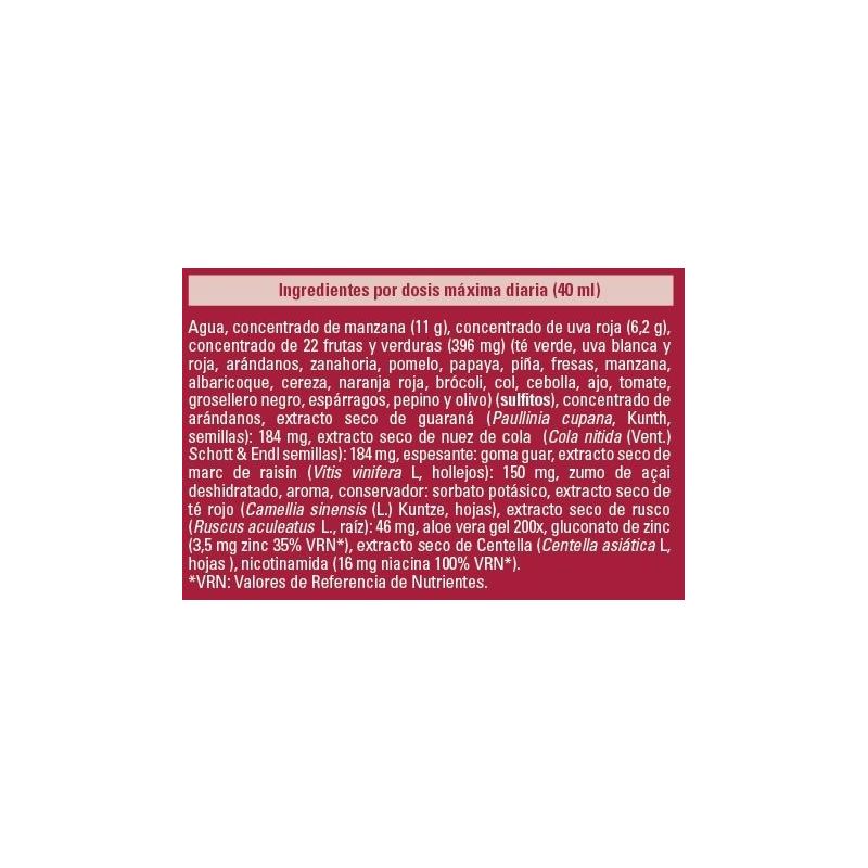 Agua, concentrado de manzana, concentrado de uva roja, concentrado de 22 frutas y verduras (té verde, uva blanca y roja, arándanos, zanahoria, pomelo, papaya, piña, fresas, manzana, albaricoque, cereza, naranja roja, brócoli, col, cebolla, ajo, tomate, grosellero negro, espárragos, pepino y olivo)(SULFITOS), concentrado de arándanos, extracto seco de guaraná (Paullinia cupana Kunth., semillas), extracto seco de nuez de cola (Cola nitida L. , semillas ), espesante (goma guar), extracto seco de marc de raisin (Vitis vinifera L, hollejos), zumo de açai, aroma, conservador (sorbato potásico), extracto seco de té rojo (Camellia sinensis (L.) Kuntze, hojas), extracto seco de rusco (Ruscus aculeatus L., rizoma), gel de Aloe vera (200 :1), gluconato de zinc, extracto seco de centella (Centella asiática L, hojas), nicotinamida.