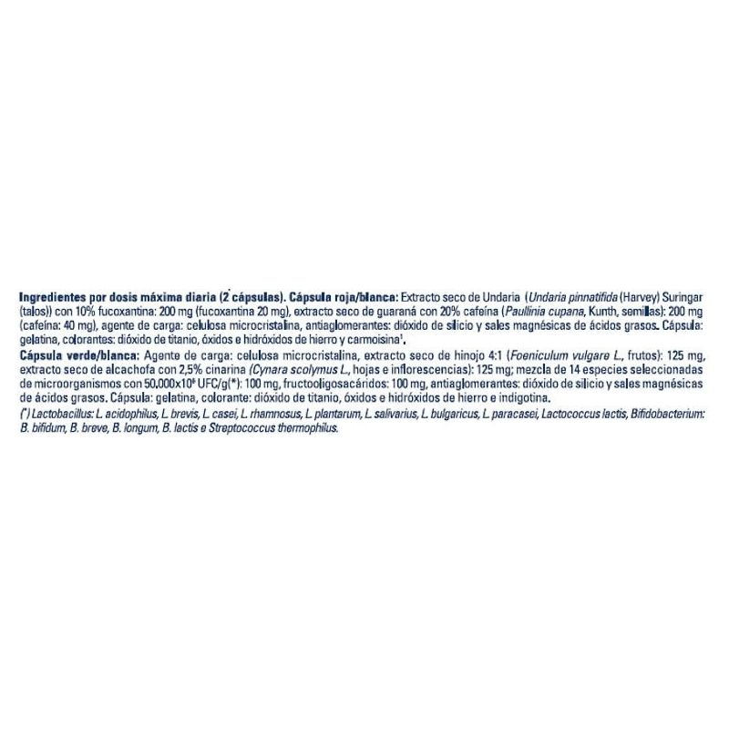 CÁPSULA ROJA / BLANCA: [extracto seco de undaria (Undaria pinnatifida (Harvey)Suringar, talos), extracto seco de guaraná (Paullinia cupana Kunth., semillas), agente de carga (celulosa microcristalina), antiaglomerantes (dióxido de silicio, sales magnésicas de ácidos grasos), Cápsula (gelatina, colorantes (dióxido de titanio, óxidos e hidróxidos de hierro y carmoisina (1))], CÁPSULA VERDE / BLANCA: [agente de carga (celulosa microcristalina), extracto seco de hinojo (Foeniculum vulgare Mill.,frutos), extracto seco de alcachofa (Cynara scolymus L., inflorescencias y hojas), mezcla de 14 especies seleccionadas de microorganismos (50000 millones UFC/g)(*), fructooligosacáridos, antiaglomerantes (dióxido de silicio, sales magnésicas de ácidos grasos), cápsula (gelatina, colorantes (dióxido de titanio, óxidos e hidróxidos de hierro e indigotina))]. (*)Lactobacillus salivarius, Lactobacillus bulgaricus, Lactobacillus paracasei, Lactococcus lactis, Bifidobacterium bifidum, Lactobacillus acidophilus, Lactobacillus brevis, Lactobacillus casei, Lactobacillus rahmnosus, Lactobacillus plantarum, Bifidobacterium breve, Bifidobacterium longum, Bifidobacterium lactis y Streptococcus thermophilus