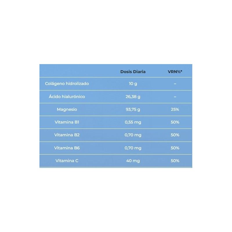 Colágeno hidrolizado porcino, Corrector de la acidez: ácido cítrico anhidro, Carbonato de magnesio, Agente de carga: xilitol, Aroma cítrico natural, Aroma de limón, Naranja liofilizada ( Citrus sinensis( L) Osbeck), Aroma natural de limón, Ácido L-ascórbico, Hialuronato sódico ( 95% ácido hialurónico), Edulcorante: sucralosa, Clorhidrato de piridoxina, Riboflavina, Clorhidrato de tiamina. Por 100g: Colágeno hidrolizado: 80 g Ácido hialurónico: 210,48 mg Magnesio: 852,27 mg Vitamina B1: 5 mg Vitaina B2: 6,36 mg Vitamina B6: 6,36 mg Vitamina C: 363,63 mg