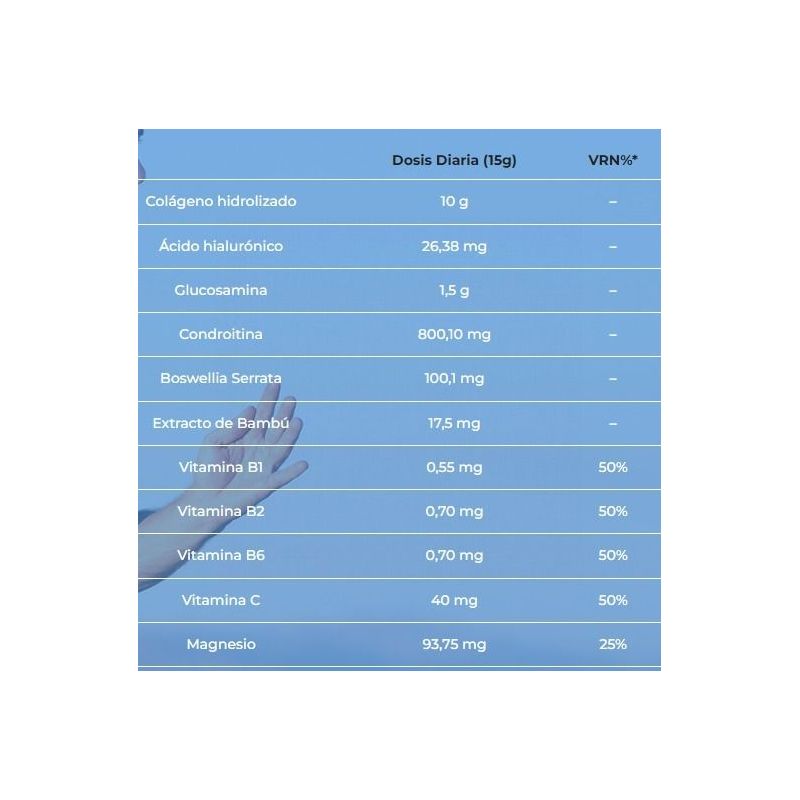 Complemento alimenticio a base de colágeno, glucosamina, condroitina, ácido hialurónico, silicio y boswellia.