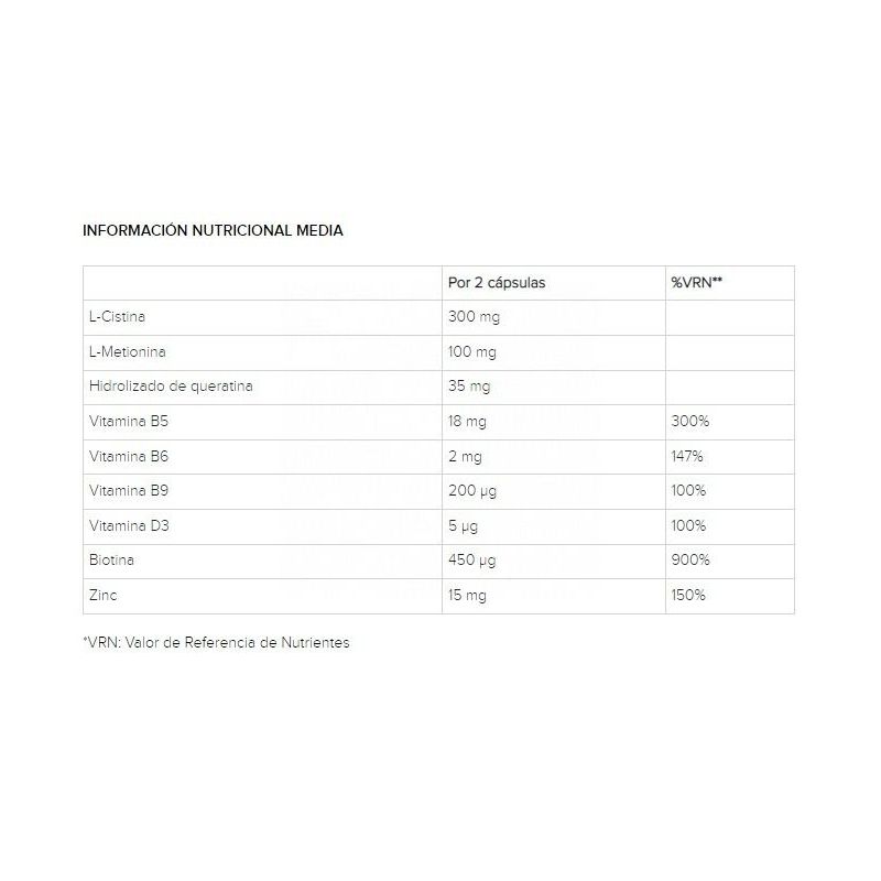 L-cistina - L - metionina - Agente de carga: celulosa - Hidrolizado de queratina - Vitamina B5 - Óxido de zinc - Antiaglomerante: estearato de magnesio - Vitamina B6 - Vitamina D3  - Biotina - Vitamina B9.