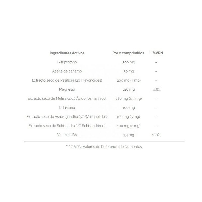 • Cada comprimido de Nervipass Cannabis Sativa® tiene una combinación exclusiva y efectiva de Triptófano, Magnesio, aceite de cáñamo y vitamina B6 que combinado con plantas relajantes como la pasiflora y la melisa profieren al paciente serenidad y armonía en su dia a día.