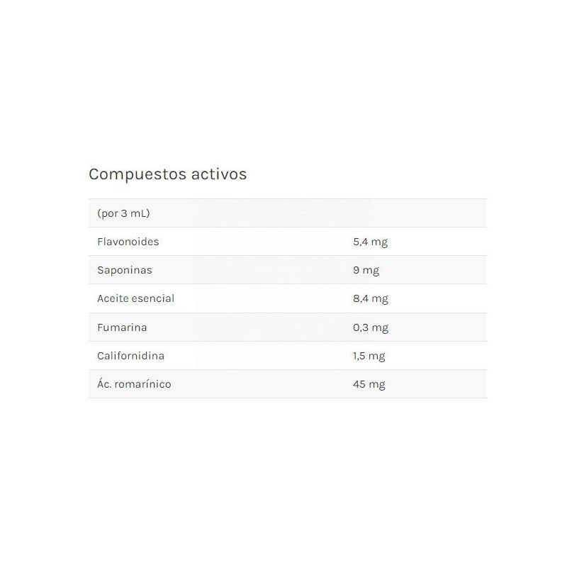 (por 3 mL) Agua, humectante: glicerina, extracto liofilizado de Melisa (Melissa officinalis L., hojas) (427,2 mg), extracto liofilizado de amapola de california (Eschscholtzia californica Cham, p. Aérea) (300 mg), extracto liofilizado de grosellero negro (Ribes nigrum L., hojas) (160 mg), gamma-ciclodextrinas (91,2 mg), alfa-ciclodextrinas (73,2 mg), extracto liofilizado de pensamiento (Viola tricolor L., p. Aérea) (71,4 mg), extracto liofilizado de helicriso (Helichrysum italicum (Roth) G. Don, sum. Florida) (62,4 mg), extracto liofilizado de fumaria (Fumaria officinalis L., p. Aérea) (52,5 mg), aceite esencial de hisopo (Hyssopus officinalis L., hojas) (8,4 mg).