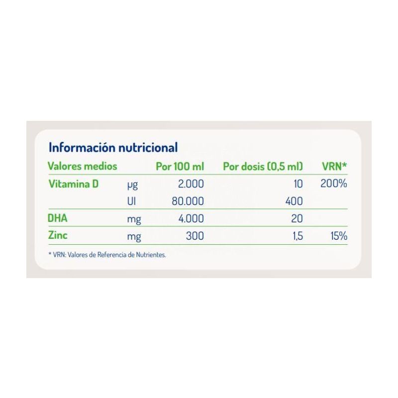 Triglicéridos de cadena media (origen coco), aceite de microalgas Schizochytrium sp, óxido de zinc, vitamina D (Colecalciferol)