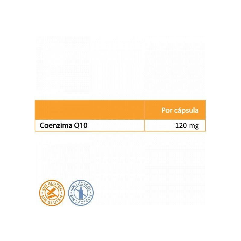 Agente de carga (celulosa), coenzima Q10 (ubiquinona) 120 mg, envoltura (gelatina), edulcorante (xilitol), transportador (goma laca).