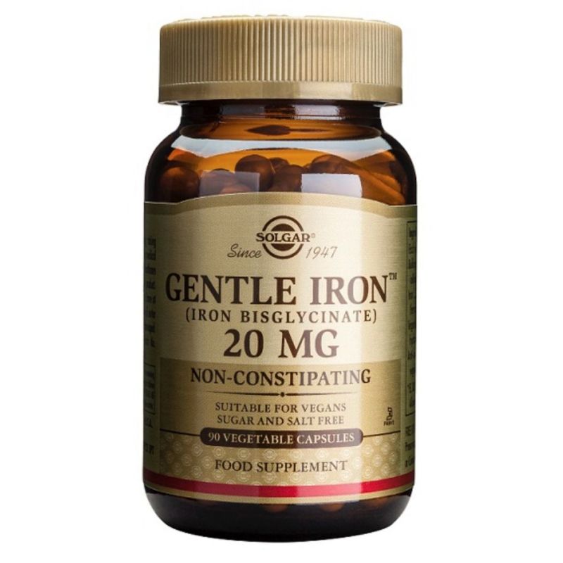 Solgar® Hierro Gentle 20 mg es una excelente opción para aquellas personas que experimentan problemas al tomar los típicos suplementos de hierro. Esto puede deberse a efectos secundarios como malestar, estreñimiento o complicaciones intestinales. La innovadora composición de Solgar emplea hierro bisglicinato, una variante de hierro diseñada específicamente para abordar estas dificultades.