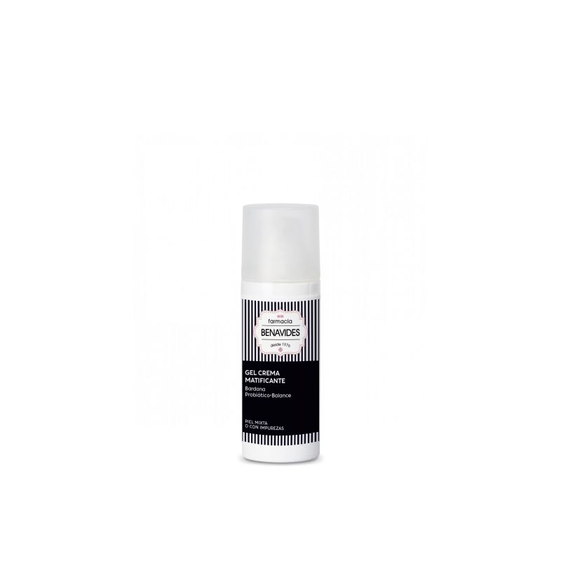 Gel Crema matificante de Farmacia Benavides reduce el sebo, disminuye las imperfecciones, neutraliza el brillo y refuerza la barrera cutánea con efecto MATE de larga duración.