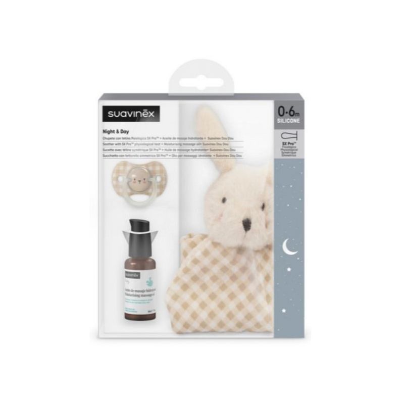Conjunto Suavinex para Recién Nacido: Peluche Dou Dou de conejito, aceite de masaje hidratante para la piel y chupete con tetina fisiológica SX Pro.