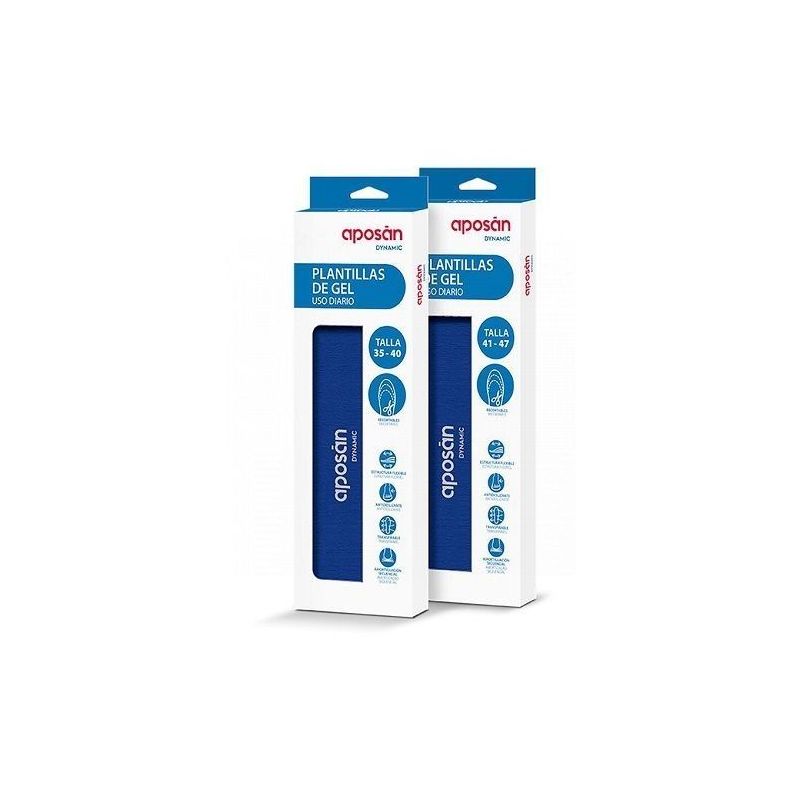 Aposan Dynamic Plantillas de Gel, tamaño 35-40, proporcionan alivio y prevención de dolores asociados a correr o caminar. Para una colocación precisa, medir y recortar según la plantilla original del calzado. Tratan espolón calcáneo, bursitis plantar, talalgias, metatarsalgia, pies dolorosos y cansados. Inicia con la plantilla apoyan para una correcta aplicación.