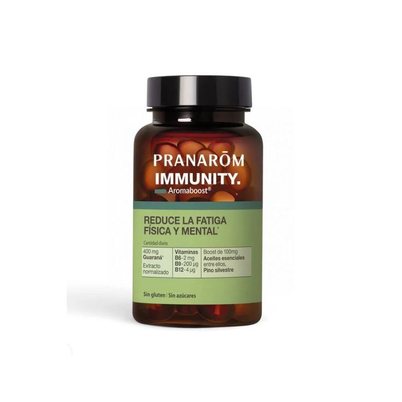 Aromaboost IMMUNITY es un complemento alimenticio diseñado para fortalecer el sistema inmunológico y garantizar el buen funcionamiento de las defensas del organismo. Estas cápsulas, sin riesgo de adicción, ayudan a mantener un sistema inmunológico saludable con una cura recomendada de 1 mes. Formuladas con extracto seco estandarizado de equinácea, vitaminas B9, B12 y D3, y enriquecidas con una sinergia de aceites esenciales de Ravintsara, jengibre y clavo, Aromaboost IMMUNITY presenta un 99.9% de ingredientes de origen natural, sin azúcar y sin gluten. Completa tu ritual alimentario con el Roll-on IMMUNITY, un gesto simple e instantáneo para fortalecer la inmunidad en cualquier momento del día.