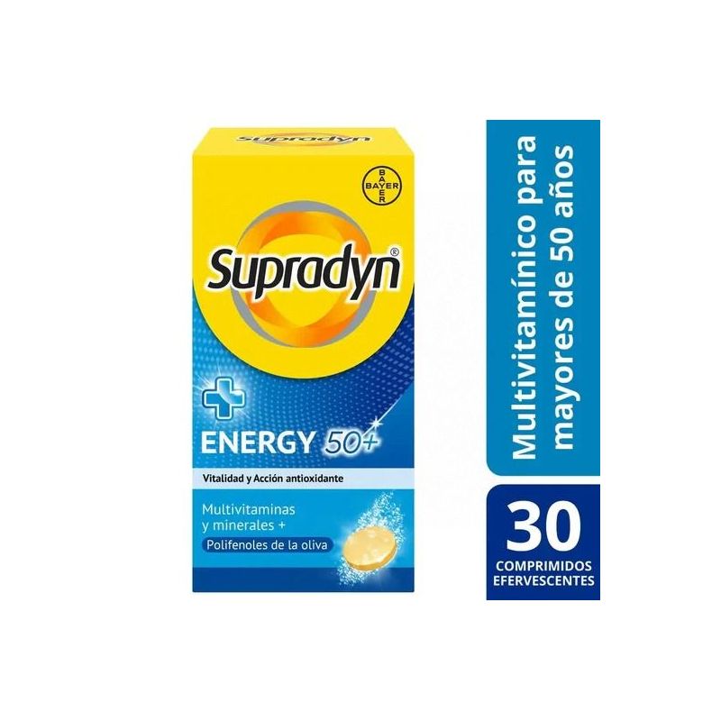 Supradyn energy es un complemento alimenticio que ayuda a incrementar el buen funcionamiento del sistema inmune, la vitalidad tanto física como mental y el metabolismo de los nutrientes que se consumen diariamente en una dieta equilibrada. También ayuda a proteger todas las células del cuerpo del daño oxidativo y aporta energía para poder realizar todas las actividades diarias. Está compuesto por alrededor de 12 vitaminas y 9 minerales esenciales. Las vitaminas b1, b6 y b12 ayudan a que el cuerpo obtenga energía del procesamiento de los nutrientes de una manera más eficaz. Las vitaminas c, e y el selenio proporcionan un efecto antioxidante que protege a las células del daño oxidativo que es ocasionado por los radicales libres. Las demás vitaminas y minerales tienen el objetivo de regular el funcionamiento del organismo y equilibrarlo. Y, por último, el extracto de oliva, que contiene polifenoles, tiene la capacidad de prevenir el envejecimiento celular y las afecciones al sistema cardiovascular. ¿para quién está indicado? está indicado para todos aquellos adultos mayores de 50 años que deseen continuar con un estilo de vida muy activo, mantener una buena salud y tener un sistema inmune en buen estado.