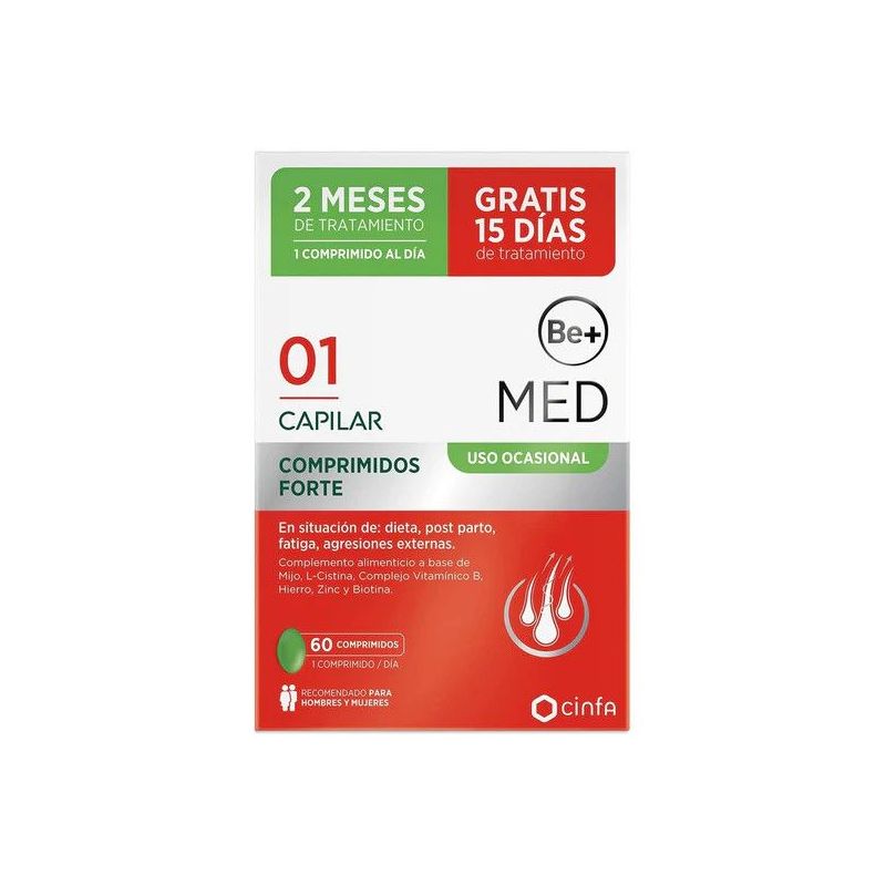 Be+ med capilar uso ocasional forte es un tratamiento nutricional de apoyo diseñado específicamente para situaciones de pérdida de cabello de carácter puntual: épocas de dietas restrictivas, el periodo post-parto, fases de fatiga o tras agresiones externas al cuero cabelludo. La fórmula integra una combinación sinérgica de activos clave: - extracto seco de mijo (panicum miliaceum), cereal rico en hierro y magnesio, que aporta nutrición al folículo capilar. - l-cistina, aminoácido que estimula la producción de queratina, componente mayoritario del cabello. - zinc y biotina (vitamina b8), que contribuyen al mantenimiento del cabello en condiciones normales. - vitaminas del grupo b (b1, b2, b3, b5, b6, b9, b12) además de vitaminas c y e antioxidantes, que apoyan el crecimiento capilar, la microcirculación y ayudan a neutralizar el estrés oxidativo. Indicado para adultos que experimentan una caída del cabello de carácter circunstancial, be+ med capilar uso ocasional forte favorece un cabello más denso, con mayor brillo y fortaleza, trabajando desde el interior. No sustituye una dieta equilibrada ni un estilo de vida saludable.