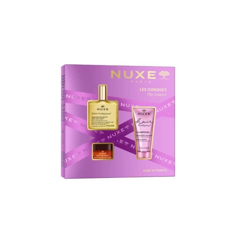 El cofre nuxe es una selección perfecta para mimar cuerpo, cabello y labios con productos emblemáticos de la marcaIncluye el reconocido huile prodigieuse, un aceite multifunción que nutre, suaviza e ilumina piel y cabello con su inconfundible aromaSe acompaña de un champú suave en tamaño 50 ml, ideal para limpiar sin resecar y aportar brillo natural, y del bálsamo labial rêve de miel, conocido por su poder reparador y nutritivo incluso en labios muy secosUn trío imprescindible para quienes buscan hidratación, confort y un toque de lujo cotidiano.
