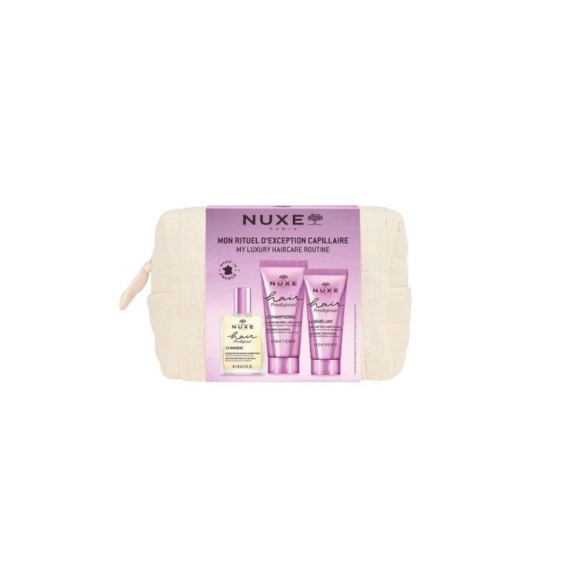 El nuxe neceser beauty essentials prodigieux – rutina capilar reúne todo lo necesario para un cuidado completo del cabello con la sensorialidad característica de la línea hair prodigieux®Incluye una mascarilla nutritiva pre-champú (30 ml) que repara y fortalece la fibra capilar, un champú brillo sublime (50 ml) que limpia suavemente aportando luminosidad, y un acondicionador brillo sublime (30 ml) que desenreda y deja el cabello suave, flexible y radiante.