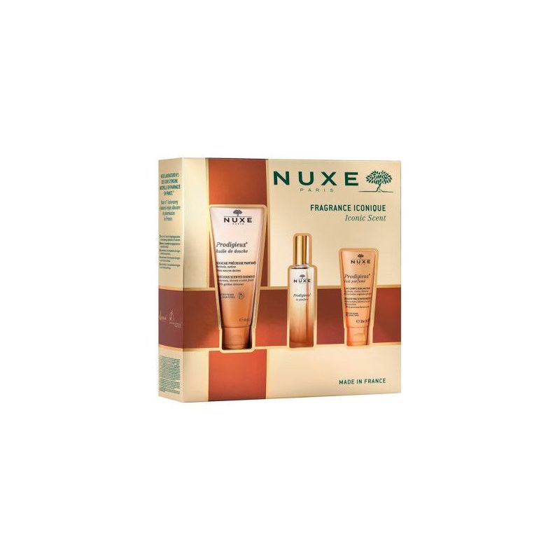 El nuxe cofre fragancia mítica ofrece una experiencia aromática envolvente con la icónica fragancia prodigieux. Incluye prodigieux le parfum (30 ml), un perfume cálido y luminoso con notas solares, el prodigieux aceite de ducha (100 ml), que limpia suavemente dejando un delicado aroma en la piel, y la prodigieux leche perfumada (30 ml), que hidrata, suaviza y prolonga la estela del perfume. Un set elegante y sensorial, perfecto para regalar o disfrutar de una rutina de cuidado con la fragancia más emblemática de nuxe