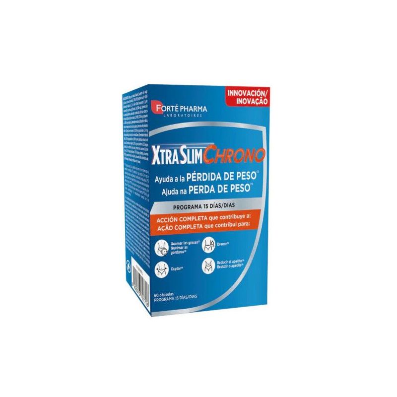 Xtraslim chrono, es una fórmula completa e innovadora que incluye: oxy-288 es un complejo exclusivo de origen natural compuesto de extractos de hojas de olivo milenario, romero y alubia, ricos en polifenoles. El saúco contribuye a la pérdida de peso y favorece la eliminación. El pimiento dulce, gracias a contener capsaicina, ayuda a quemar las grasas. El nopal ayuda a captar los azúcares y las grasas y contribuye a reducir el apetito. La fórmula de xtraslim chrono se completa con comino, mirobálano, vitaminas b5 y b6, y el dúo zinc y cromo.