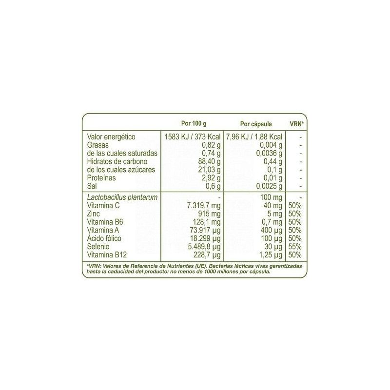 Complemento alimenticio con lactobacilos, vitamina B9 (ácido fólico), vitamina B6, vitamina B12, vitamina A, vitamina C, zinc y selenio, contribuye al normal funcionamiento del sistema inmunitario. MODO DE EMPLEO Se recomienda una cápsula al día.