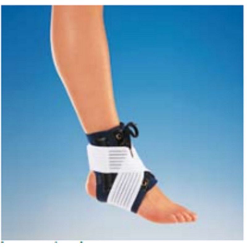 Los refuerzos laterales a ambos lados, el cierre mediante cordones y banda elástica ofrecen una mejor estabilidad al tobillo. De uso como ortesis preventiva o postquirúrgica. Disponible en cinco tallas.