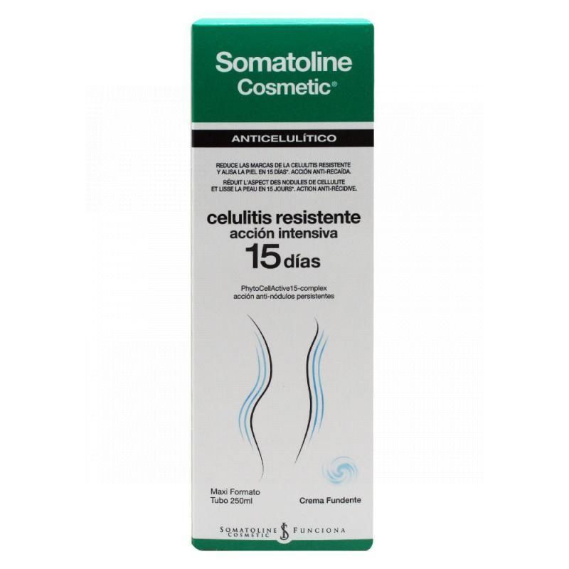Somatoline Celulitis Resistente 15 días es una crema anticelulítica de acción ultra-intensiva que combate los nódulos adiposos en 15 días, con una sola aplicación al día.