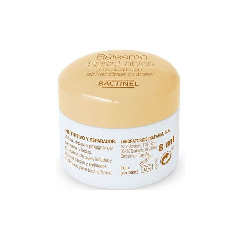 Bactinel bálsamo nariz y labios con aceite de almendras dulces es un bálsamo nutritivo y reparador de textura cremosa para nutrir, reparar y proteger la piel irritada de la nariz y los labios.