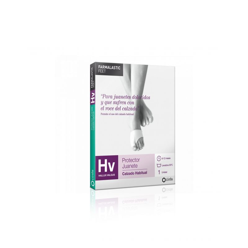 Ayuda a evitar y aliviar los dolores provocados por el juanete (hallux valgus). Ayuda a reducir la presión/fricción excesiva sobre el juanete. El protector de juanete incorpora el gel de silicona patentado Epithelium 26 de 1 mm de espesor que distribuye las presiones, limita el roce y ayuda a alivaiar el dolor ocasionado por el junente. Fino y ligero, puede utilizarse a diario con el calzado habitual. Silicona 39% y poliamida/elestano 61%. Marcado CE. Clase I. No estéril. MODO DE EMPLEO Puede utilizarse tanto en el pie derecho como en el izquierdo. Introducir el pie en la prenda, haciendo que el pulgar se inserte en el comportamiento diseñado al efecto. Recomendamos utilizar medias o calcetines. En personas que padezcan diabetes, arteritis, polineuritis, neuropatía de los miembros inferiores o úlceras varicosas, vigilar durante la utilización, especialmente que la banda entre los dedos no genere fricción. PRECAUCIONES Y ADVERTENCIAS No aplicarlo sobre una herida no protegida. En el caso de personas enfermas de arteritis, diabetes, polineuritis, neuropatía de los miembros inferiores o úlceras varicosas, no aplicar nunca el producto directamente sobre una herida, vigilar el pie durante la utilización y en todos los casos consultar al médico o al podólogo. La tira puede causar roces entre los dos dedos. CONSERVACIÓN Y CADUCIDAD Se lava máquina a 30ºC o a mano (sin frotar). Dejar secar al aire. No se plancha.